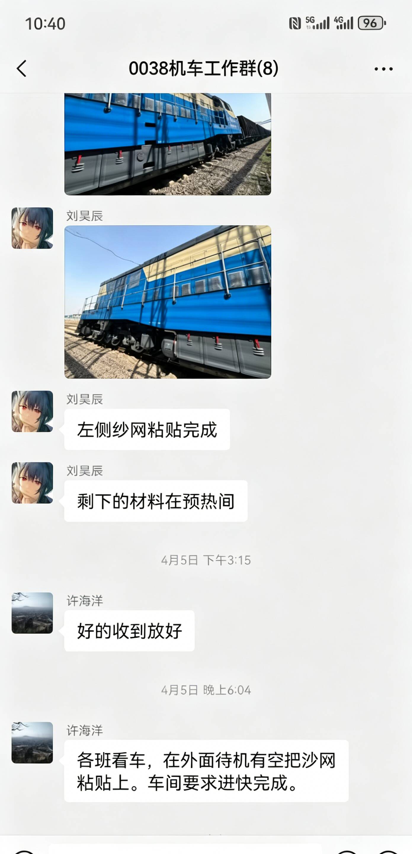 职工刘昊辰在群里反馈“左侧纱网粘贴完成”,许海洋随即安排“各班看车,在外面待机有空把纱网粘贴上”一条条简短的工作指令,织成了一张密实的防护网。