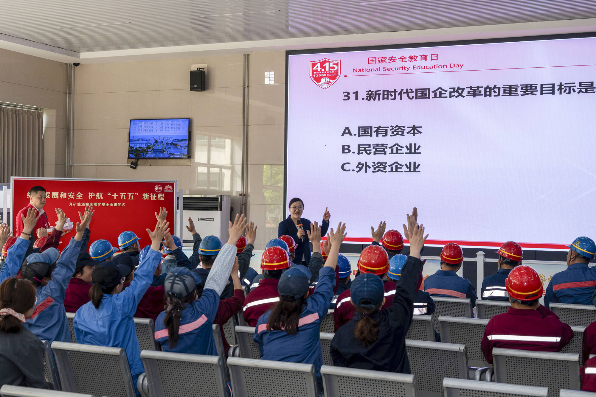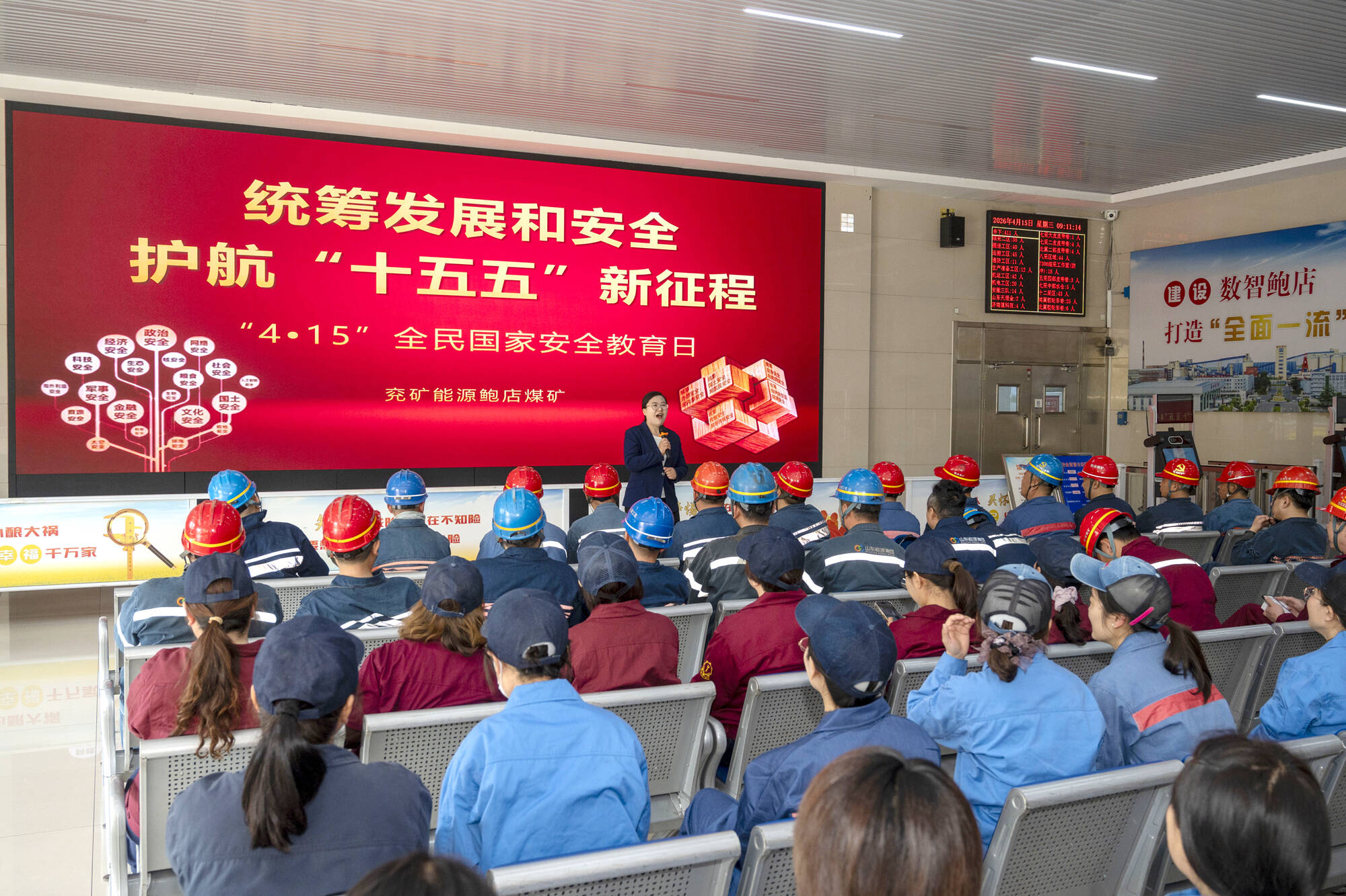 4月15日,鲍店煤矿在井口候罐大厅开展“统筹发展和安全 护航‘十五五’新征程”“4·15”全民国家安全教育日活动,进一步普及国家安全知识,强化干部职工安全防范意识。