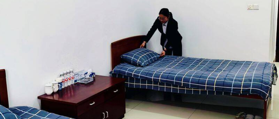 走进106公寓房间,保洁人员正忙着整理刚退房的宿舍,被褥拉得平整无褶皱,枕头摆放整齐划一,随后又仔细擦拭衣橱、清扫卫生间,不放过任何一个卫生死角,用细致的服务,为职工营造干净整洁的居住环境。